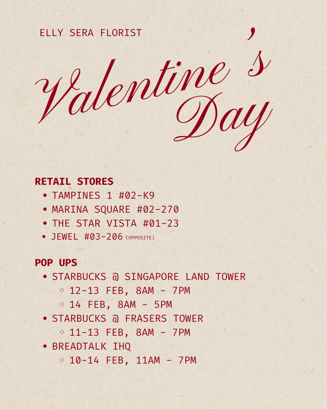 Kindly note that replies may be slower from 12–14 Feb due to the Valentine’s Day peak period. For delivery orders, flowers will be fulfilled within the selected delivery timeslot. For self-collection, kindly provide your order number to our florist in-store. Thank you for your understanding and support!